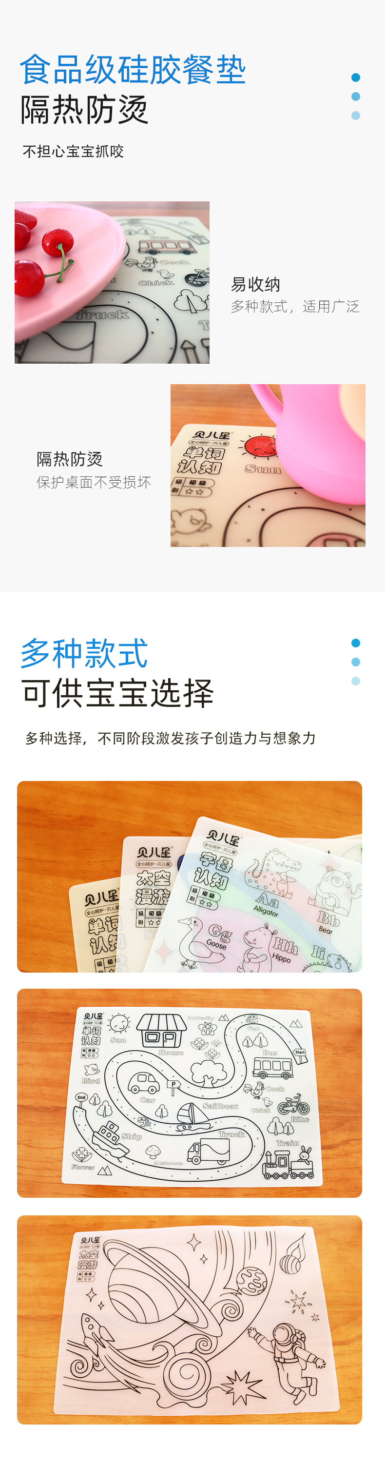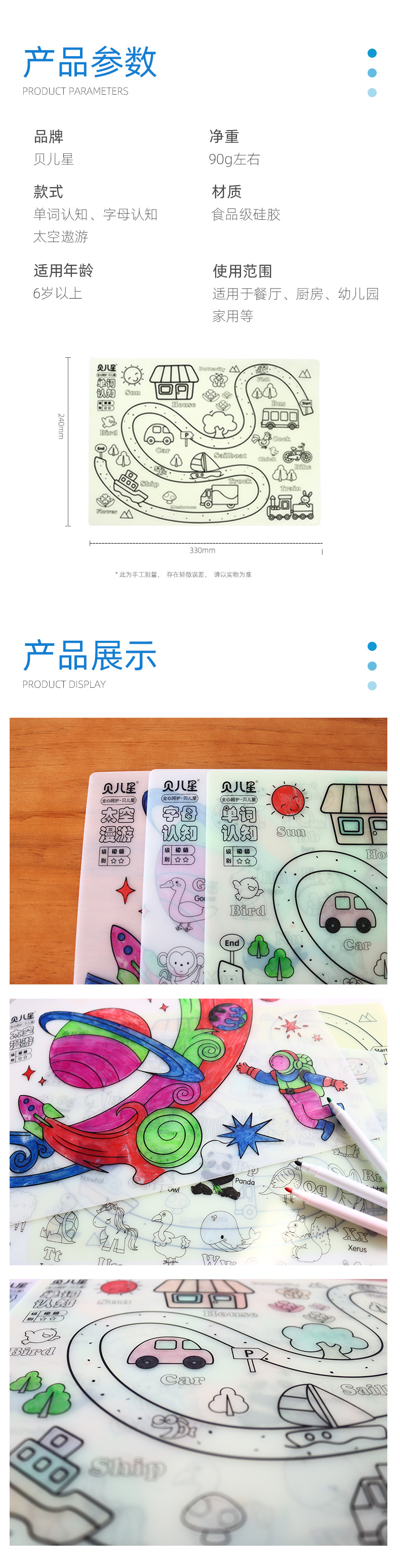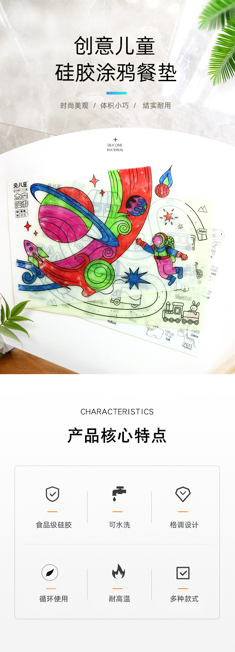硅膠涂鴉畫板產品的主要買點源于產品的表面圖案以及配套的創意,產品從6-12歲之間具有不同的主題與認知圖案,可以連接整體進行學習提升大腦開發,加強兒童動手能力以及創新創作能力,此外產品配比水性可清洗彩色筆,不會對硅膠表面產生筆污以及筆畫痕跡,材料屬于柔軟回彈食品級硅膠,所以硅膠店鋪可以任意曲折來回折疊不會變形損壞,此外硅膠墊片可水性可隔熱,可耐高低溫,可以在多個行業領域當中運用!
